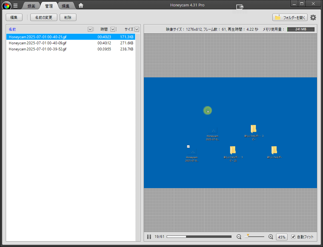 「ScreenToGif」のようなサムネイル表示がいいか、「Honeycam」のようなシークバーで内容を確認するのがいいかは好みが分かれると思います。