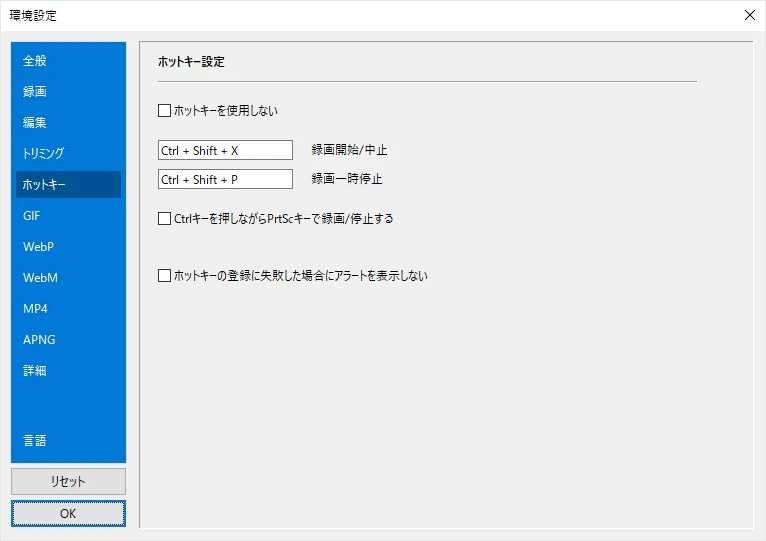 ホットキー(ショートカットキー)は録画の開始、中止、一時停止のみ設定可能。