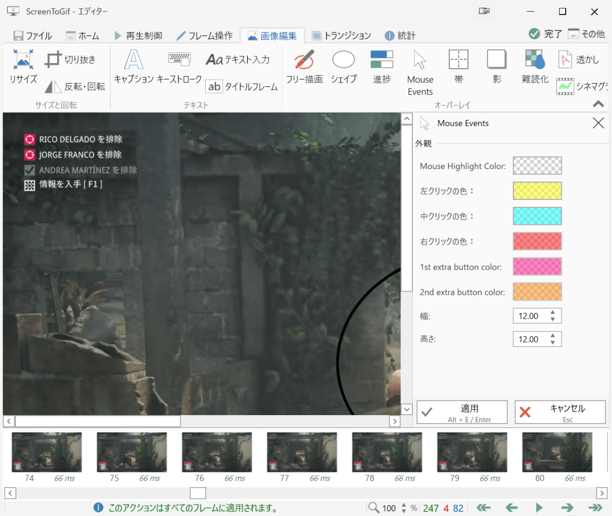 (これが、普通の動画編集ソフトの感覚だと手間に感じました・・・w。出来れば全ての効果を『フレームの複数選択後、上のアイコンをクリック』で統一して欲しいのが本音です。)